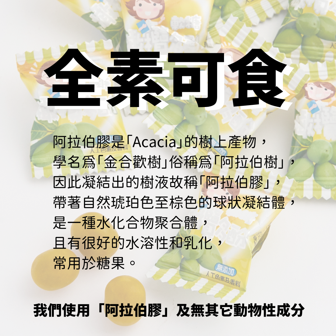 成 分:砂糖、麥芽糖、天然橄欖粉、阿拉伯膠、未氫化椰子油、檸檬酸、